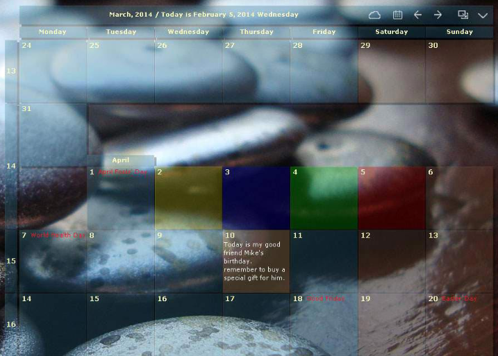 대표적인 기능으로 바탕화면에 달력을 띄워놓고 사용할 수 있습니다. 특정 날짜의 색을 변경하여 표시를 줄 수 있으며, 글꼴을 변경할 수 있습니다. 달력에 표시된 화살표 아이콘을 선택하면 날짜 검색이 가능하게 됩니다. 특정 날짜에 메모를 남기기 위해서는 해당 날짜를 더블클릭합니다. 메모가 가능한 창이 뜨면 내용을 입력한 후, 해당 창 상단에 있는 체크모양 아이콘을 선택하여 기록할 수 있습니다.