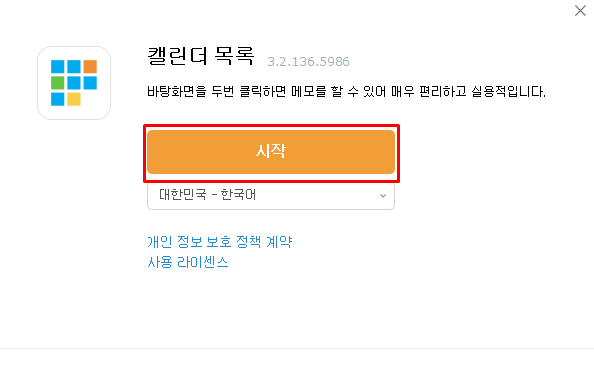 프로그램 설치 과정은 단순하게 진행할 수 있습니다. 기본적으로 사용할 언어를 선택한 후, [시작] 버튼을 선택하면 설치를 진행할 수 있습니다.