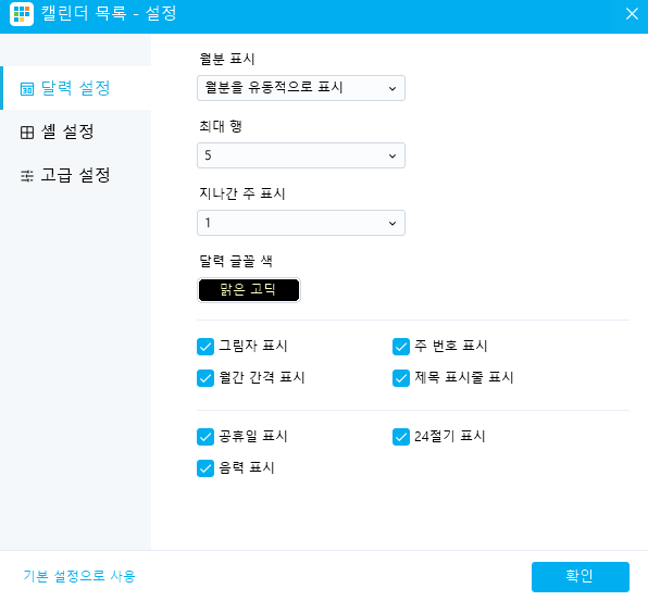 환경 설정에는 '달력 설정, 셸 설정, 고급 설정'의 카테고리가 있습니다. 달력의 글꼴 변경은 '셸 설정'에서 가능합니다. 달력 글꼴 색 변경은 '달력 설정'에서 가능합니다. 고급 설정에서는 '쉬는 요일', '시작 요일'등을 설정할 수 있습니다.