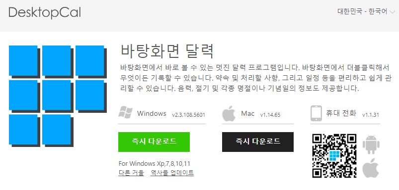 가장 먼저 바탕화면 달력 위젯인 Desktopcal 프로그램을 다운로드할 필요가 있습니다. 만약, 이미 설치가 되어있다면 실행하면 됩니다. 바탕화면 달력은 공식 홈페이지(desktopcal.com)에서 다운로드를 할 수 있습니다. 지원되는 플랫폼은 Windows / Mac / 휴대전화(스마트폰) 버전이 있습니다.