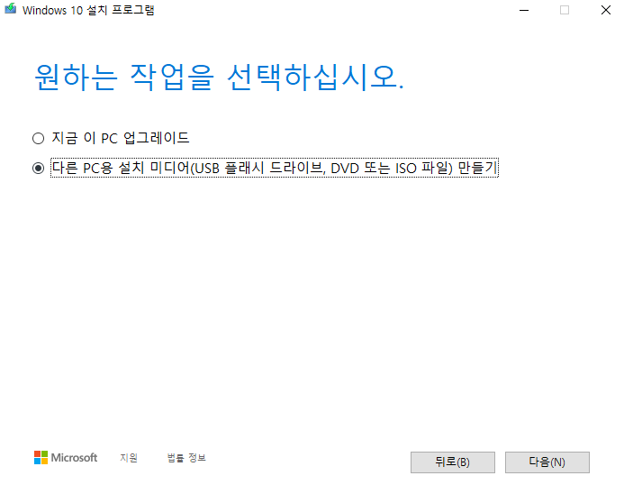다운받은 프로그램을 실행하면 여러 선택 사항이 주어지게 됩니다. 가장 먼저 이용권한에 대한 동의를 합니다. 다음으로 '지금 이 PC 업그레이드', '다른 PC용 설치 미디어 (USB 플래시 드라이브, DVD 또는 ISO 파일) 만들기'의 선택 사항이 주어집니다. USB 부팅 디스크를 만들기 위해서는 두번째 메뉴인 [다른 PC용 설치 미디어(USB 플래시 드라이브, DVD 또는 ISO 파일) 만들기]를 선택합니다.