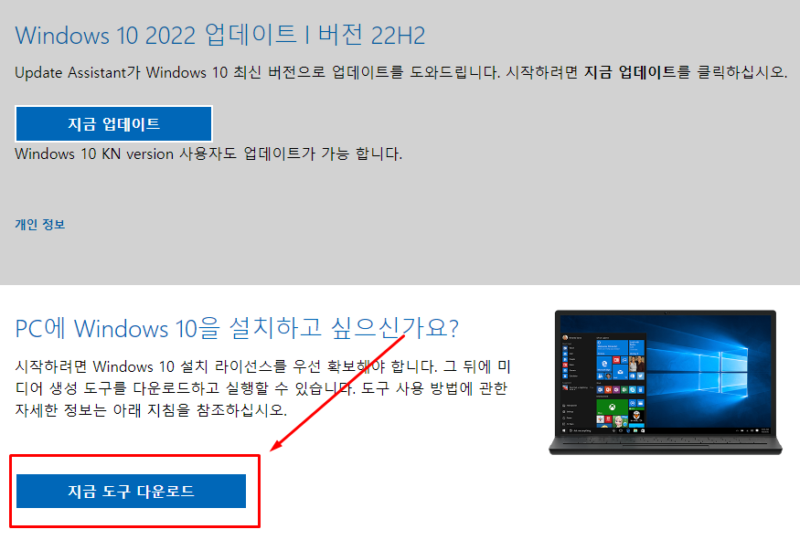 2번에서 알아본 내용을 토대로 [Windows 10 다운로드] 페이지로 접속합니다. 해당 페이지에서는 윈도우 업데이트 및 윈도우 10 설치 파일 다운로드 기능을 제공하고 있습니다. 여기서 [지금 도구 다운로드] 버튼을 선택합니다. 다운받게 되는 파일의 이름은 [MediaCreationTool22H2.exe] 파일입니다. 다운받은 파일을 실행합니다.
