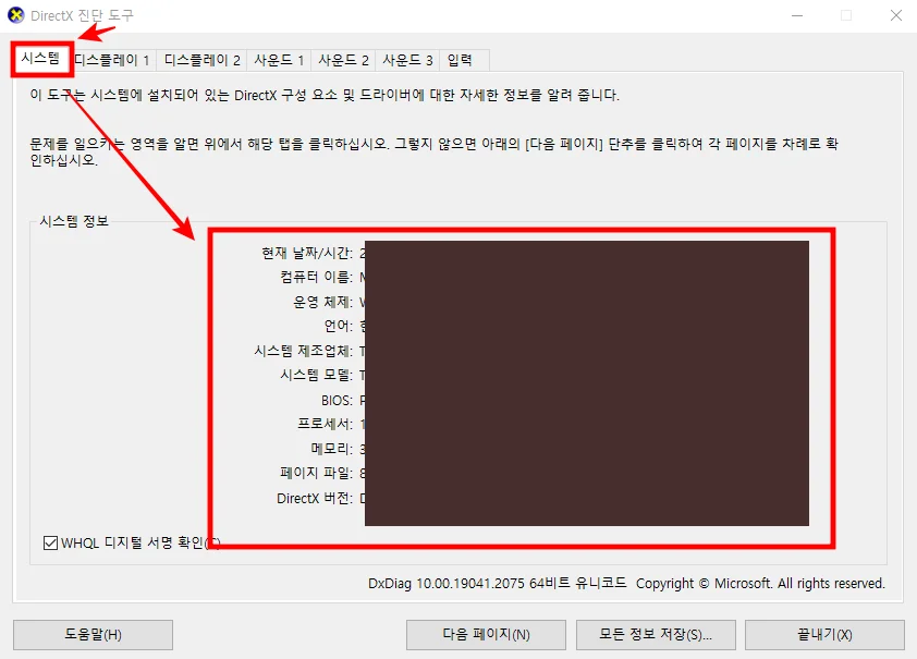 DirectX 구성 요소와 드라이버에 대한 자세한 정보를 제공하고 있습니다. 해당 탭에서는 현재 날짜/시간, 컴퓨터 이름, 운영체제, 언어, 시스템 제조업체, 시스템 모델, BIOS, 프로세서, 메모리, 페이지 파일, DirectX 버전의 정보를 확인할 수 있습니다.
