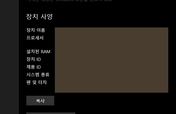 설정앱에서 윈도우 시스템 사양을 확인할 수 있습니다. 장치이름 / 프로세서 / Ram / 장치 ID / 제품 ID / 시스템 종류등에 대한 정보를 확인할 수 있습니다.
